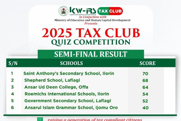 From Taiye Joseph, Ilorin Six secondary schools have advanced to the grand finale of the 2025 Kwara State Internal Revenue Service (KW-IRS) Tax Club Quiz Competition, following the successful conclusion…